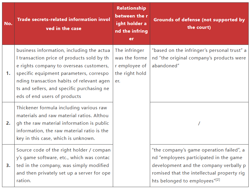 In the New Guidelines, Beijing Procuratorate displays several typical cases in relation to defining and determining the scope of trade secrets. We summarize the key take-aways reflected in those cases in the following table.