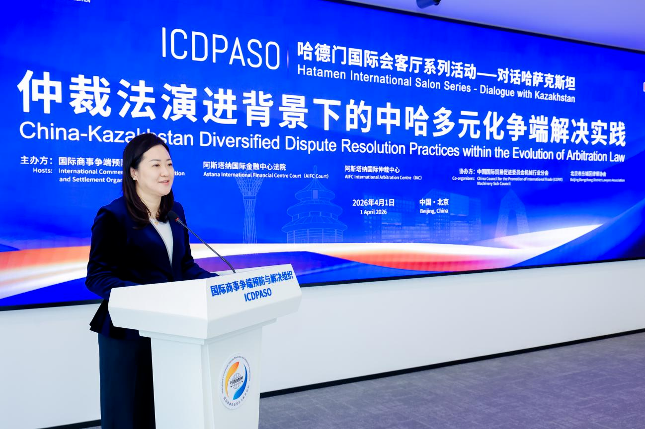 Beijing, April 1, 2026 - The “ICDPASO Hatamen International Salon Series — China-Kazakhstan Diversified Dispute Resolution Practices within the Evolution of Arbitration Law” was successfully held in Beijing. The event was co-hosted by the International Commercial Dispute Prevention and Settlement Organization (ICDPASO), the Astana International Financial Centre Court (AIFC Court), and the AIFC International Arbitration Centre (IAC), with support from the China Council for the Promotion of International Trade (CCPIT) Machinery Sub-Council and the Beijing Dongcheng District Lawyers Association. The event focused on China-Kazakhstan economic, trade and investment policies and the practical development of diversified dispute resolution mechanisms, with the aim of building a specialized international exchange platform and providing a solid legal foundation for high-quality China-Kazakhstan economic and trade cooperation.